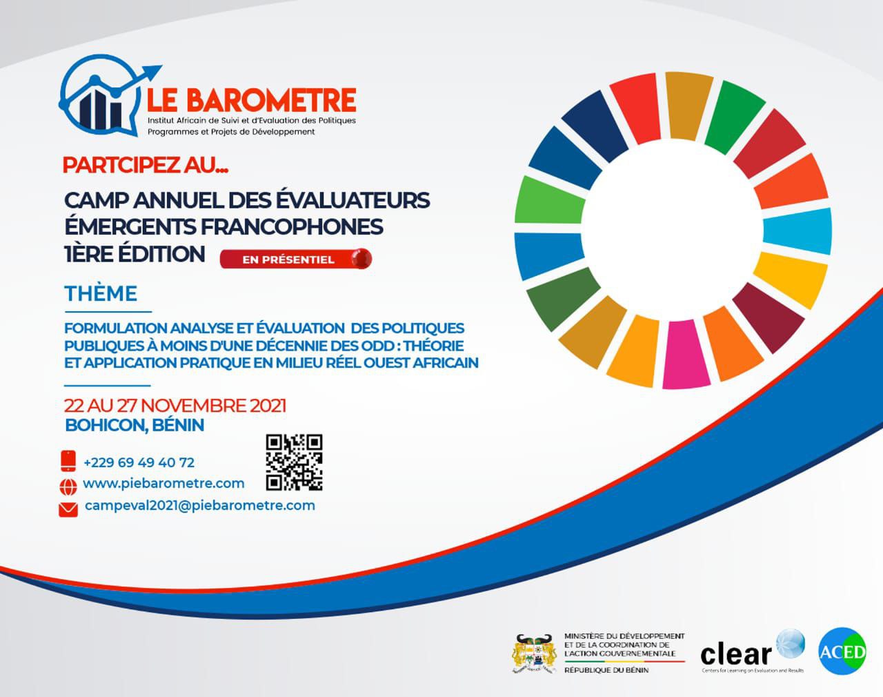 Institut Africain de Suivi et Evaluation d'Impact des Politiques Programmes et Projets de Développement, Le BAROMETRE, in partnership with the United Nations System (UNS), the Ministry of State in charge of Planning and Development of Benin, the Centre CLEAR Afrique Francophone, the Town Hall of the commune of Bohicon - Benin and Action pour l'Environnement et le Développement Durable (ACED) is organising the Annual Camp for Emerging Francophone Evaluators on the theme "Formulation Analysis and Evaluation of Public Policies less than a decade away from the SDGs: Theory and Practical Application in a Francophone West African Environment".